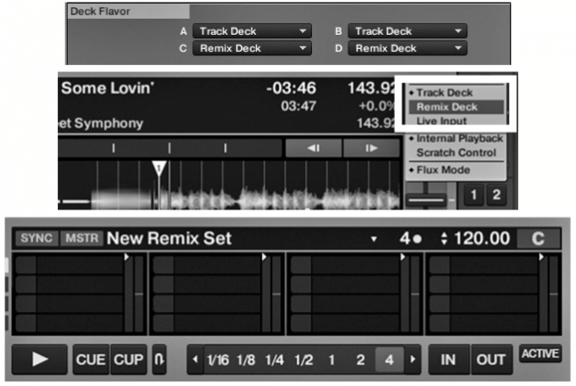 [Índice]Si nos fijamos un poco veremos que hay partes del reproductor que son comunes e iguales sin importar el tipo de reproductor que tenemos seleccionado, tenemos el botón Play y tenemos el selector de loops, los pulsadores IN y OUT, CUE, CUP, SYNC, MASTER, el medidor de fase, etc. Esto queda también muy bien reflejado en el hecho de que los comandos de mapeo para funciones comunes de reproducción están agrupados en la pestaña Deck Common dentro del Controller Editor, mientras que los asociados de forma exclusiva a los Track Deck y Remix Decks se encuentran agrupados en sus propios menús de comandos de mapeo.