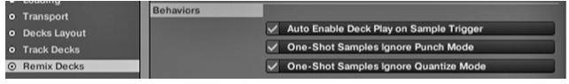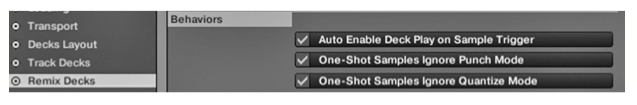 • El reproductor se pondrá en PLAY automáticamente al iniciar cualquier sample, o no dependiendo de que tengamos la opción Auto EnableDeck Play on Sample Trigger activado en las preferencias.