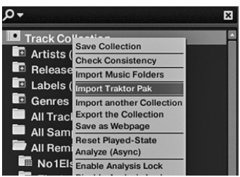 1. Iremos al nodo Track Collection en nuestro Browser y con el botón derecho elegiremos la opción Import Pak del menú desplegable. Buscaremos la carpeta en la que se encuentren nuestros archivos y elegiremos uno.