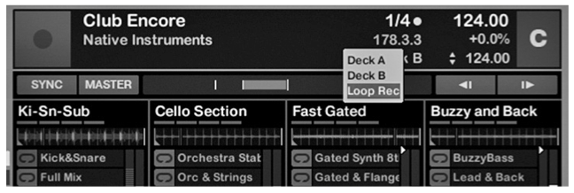 El sample capturado de ese modo tendrá una duración en beats igual a la que en ese momento esté preseleccionada en el selector de loops del reproductor de origen (esté el loop o no activo) será cargado en modo bucle (es decir, se ejecutará como un bucle) y se reproducirá desde el mismo punto de reproducción en que esté su pista de origen (si la pista está ejecutándose, el sample se cargará del mismo modo pero silenciado para evitar doble sonido). La configuración de filtro del canal correspondiente del mezclador también será copiada y podrá reajustarse empleando el mando de filtro propio de cada nicho de samples.