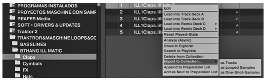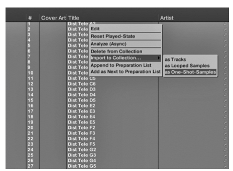 - Las importamos a la colección seleccionándolas todas y eligiendo la opción as One-Shot-Samples en el menú que aparece al clicar con el botón derecho. De esta forma quedarán añadidas al nodo All Samples de Traktor. Si se tratase de loops, obviamente habríamos escogido la opción as Looped Samples.