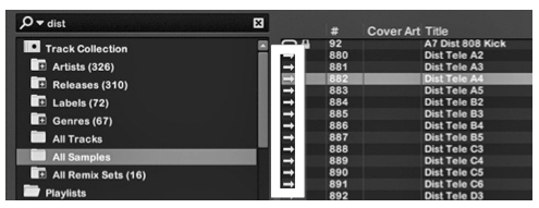 Al importar un sample desde una pista cargada en un reproductor, y tan pronto como el sample se reproduzca tres veces en el nicho dentro de la mezcla principal, será guardado automáticamente en la colección y por tanto visible en All Samples. Los samples quedan disponibles para su uso posterior en la carpeta All Samples del Buscador. Como vemos, los samples quedan identificados como tales gracias al símbolo del loop en color verde o la flecha azul y son guardados con el nombre del tema musical del que fueron extraídos, más la fecha y hora exactas de su creación.
