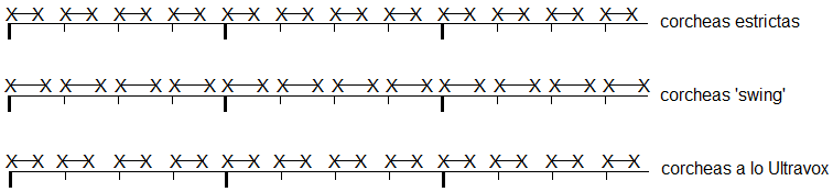 Necesariamente por el fraseo que se le imparta. Claramente no era una línea programada, no sonaba como tal. No eran corcheas puras y cuantizadas a la perfección. Pero tampoco una línea 100% interpretada, puesto que se hace difícil mantener durante minutos la regularidad tan extrema que había dentro de esos ostinatos. No era un 'swing' al uso, y que acaba resultando tan acartonado como las propias corcheas puras si es estrictamente artificial. Otras veces eran pequeños patrones de bajo repetidos pero de nuevo sonaban a medio camino entre programados y ejecutados. Y como elemento común a todos ellos, el que las notas se repetían, siempre sonaban dos veces antes de la siguiente.