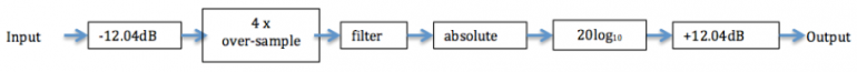 Para evitar que los cálculos intermedios de ese sobremuestreo tengan problemas (nos interesa la señal en las proximidades del límite de su recorrido), especifica también reducir previamente el nivel en 12,04dB (el equivalente a dos bits) antes del sobremuestreo para finalmente compensar esa defensa. Todo eso ya está implementado en un medidor TP. aunque para curiosos aquí os dejo el diagrama de bloques del medidor de True Peak que aparece en el estándar.