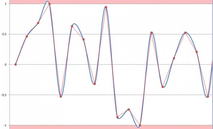 Pero no es cierto. La representación digital no necesita tener registrado el ’true peak’ para saber de él. No lo necesita, porque puede reconstruirse la señal, incluidos sus picos, y así lo hace la vuelta a una señal continua a través de un D/A. De hecho, la línea azul en las figuras anteriores representa tanto la señal de ‘entrada’ al A/D como la que ofrecería a su salida el D/A y es capaz de manifestar la realidad: la existencia de un pico que excede del valor de la muestra más alta / más baja.