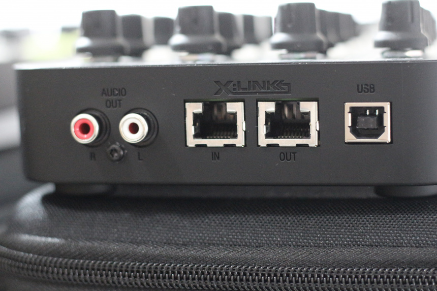 Además del puerto USB para conectar el Xone:K2 al ordenador y las conexiones de audio, estos controladores cuentan con puertos RJ45, comunmente conocidos por ser los puertos que empleamos en casa para que nuestro ordenador se conecte a internet o una red ethernet con más ordenadores, pero que en este caso sirven para conectar entre sí varios controladores Xone:K2 gracias a que estos puertos sirven para transmitir alimentación y datos, el protocolo que Allen&Heath usa para conectar entre sí los dispositivos de su marca mediante este sistema lo llaman X-Link. Gracias a estos puertos aunque tengamos más de un Xone:K2 sólo será necesario emplear un puerto USB de nuestro ordenador ya que el resto se conectarán entre ellos a través de los conectores RJ45. No obstante si tienes pensado emplear más de un Xone:K2 para funciones de audio además de MIDI, deberás emplear los puertos USB de los controladores y no los conectores RJ45, porque el ordenador no puede reconocer el interfaz de audio del dispositivo.