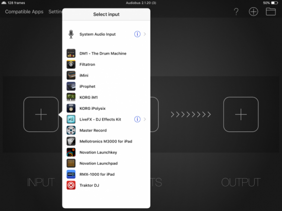 En primer lugar debemos tener conectado el interfaz de audio al ipad empleando el adaptador Lightning a USB y el hub alimentado en caso de que sea necesario. Abriremos Audiobus, observa que la interfaz tien tres símbolo “+” cada uno rotulado como Input, Effect y Ouput. Toca en Input y se desplegará una lista de aplicaciones que pueden servir de entrada, y además la opción “System Audio Input” en la parte superior, que es para elegir la entrada de audio del interfaz como fuente de sonido en lugar de una aplicación. Si tu interfaz tiene varias entradas, a la derecha de “System Audio Input” debes ver una “i” rodeada de un círculo azul, toca ahí y podrás elegir la entrada de tu interfaz. Las entradas aparecen de manera individual –mono– y en pares estéreo, elige un par estéreo; concretamente en las interfaces de Focusrite que comentaba en el material necesario se debe elegir “System Audio Input, Channel 1+2”