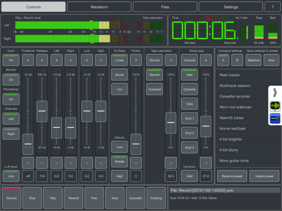 - Una aplicación de grabación compatible con Audiobus en caso de que queramos también usar el iPad para grabar sesiones. He elegido para el tutorial Master Record, que cuesta 5.99€ y además de grabar en diferentes formatos tiene algunas opciones de procesado, como emulación de cinta o algo de ecualización.