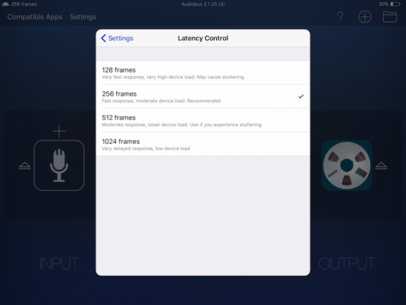 - El sonido se interrumpe ocasionalmente o hay pequeños ruidos: prueba en Audiobus a subir la latencia en Settings/Latency Control.